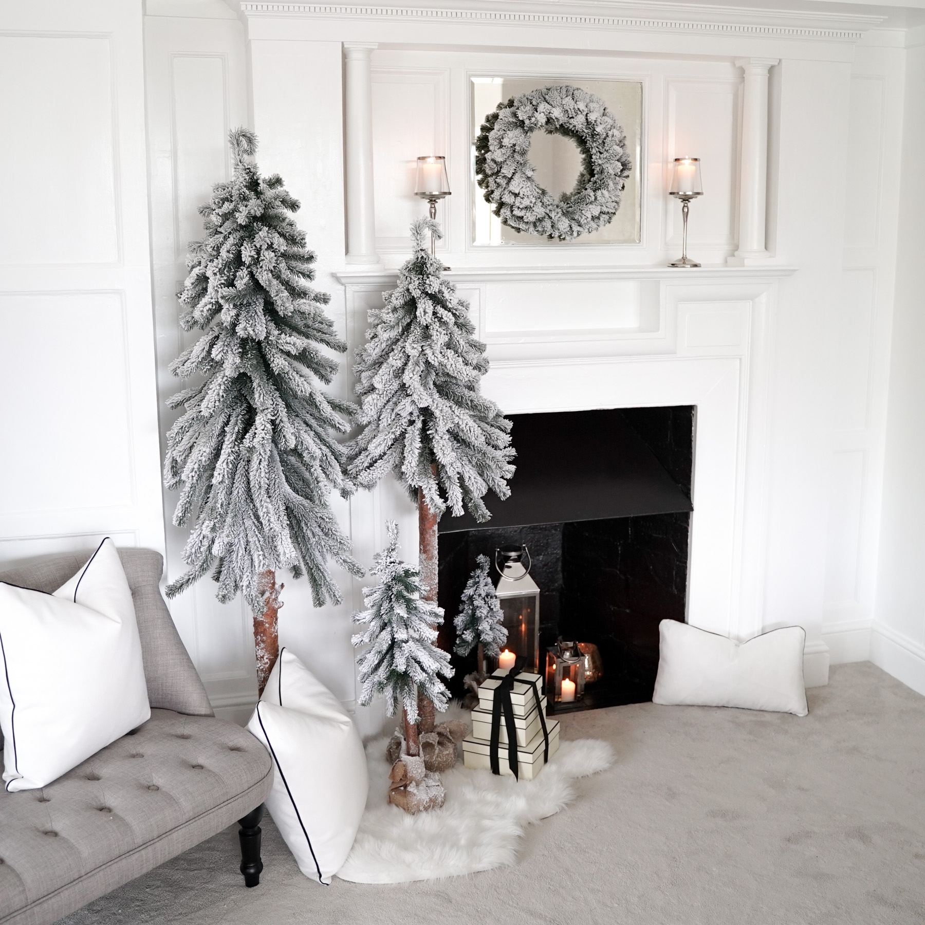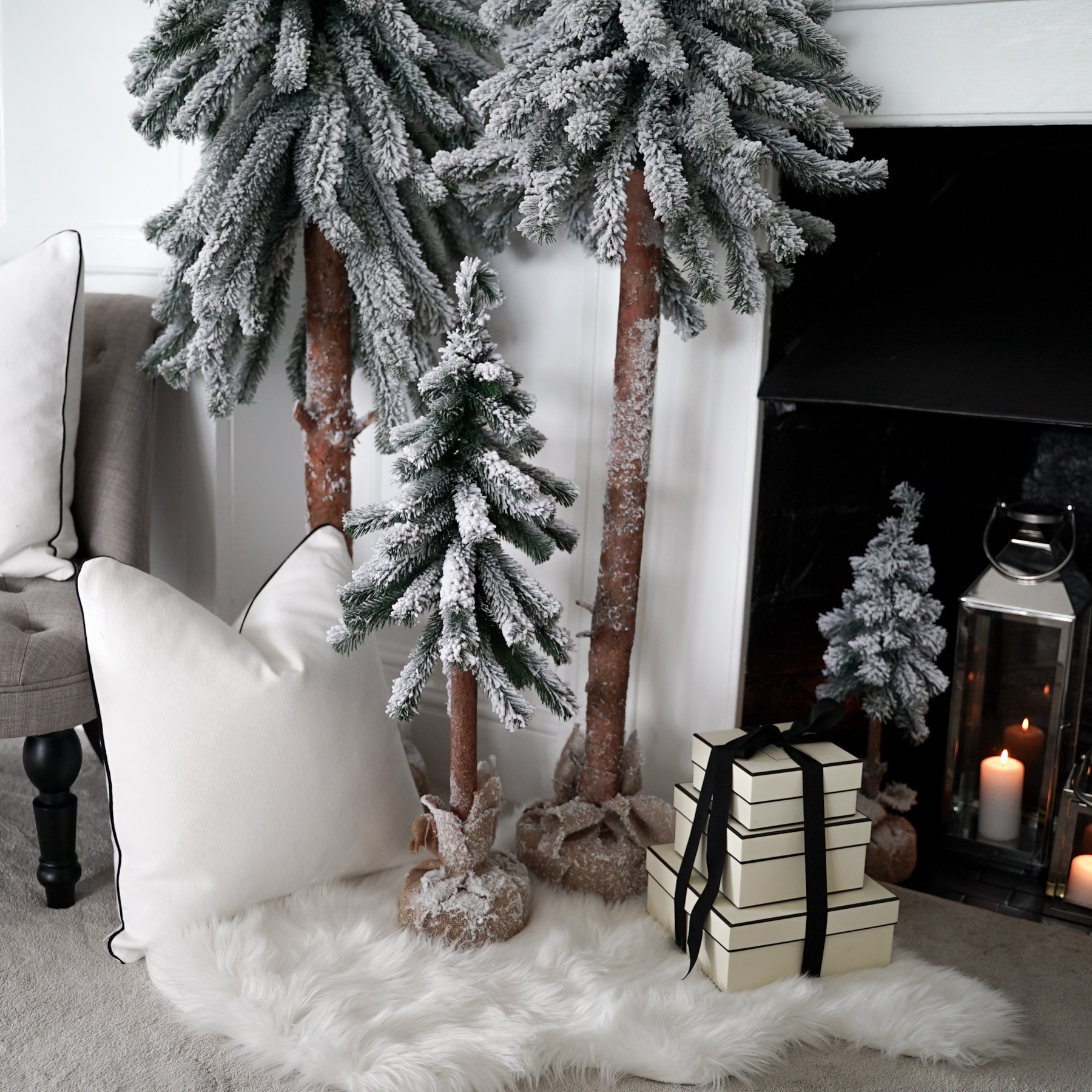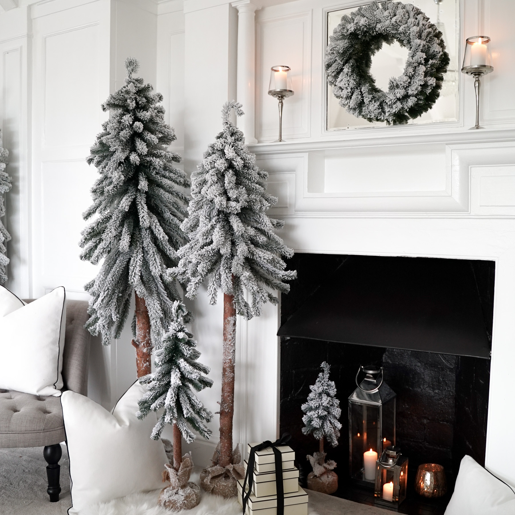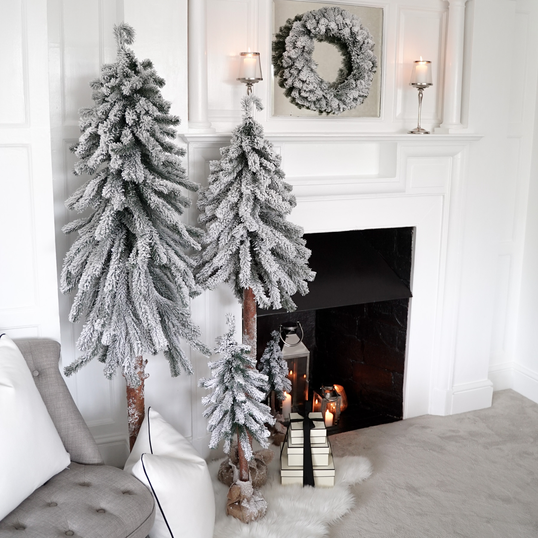 Luxurious, nordic style, handmade faux Christmas trees with natural trunk, finished with elegant frosting and natural linen cloth. Those unique and incredibly realistic trees are easy to assemble and require no decoration. All trees are proportionally slim, making them perfect for even the smallest of spaces. This beautiful set includes 3 trees in varied heights as well as a wreath to complete the look.