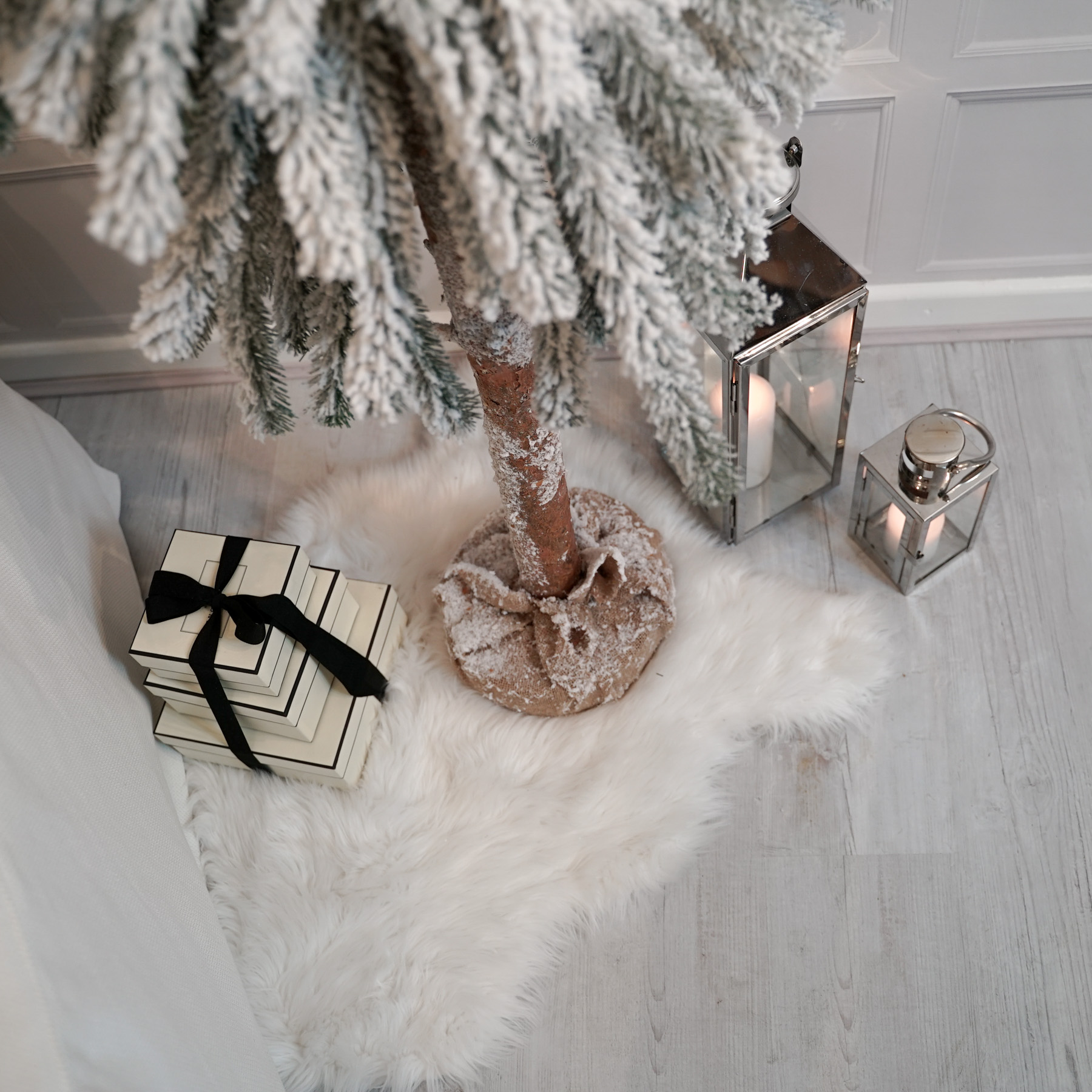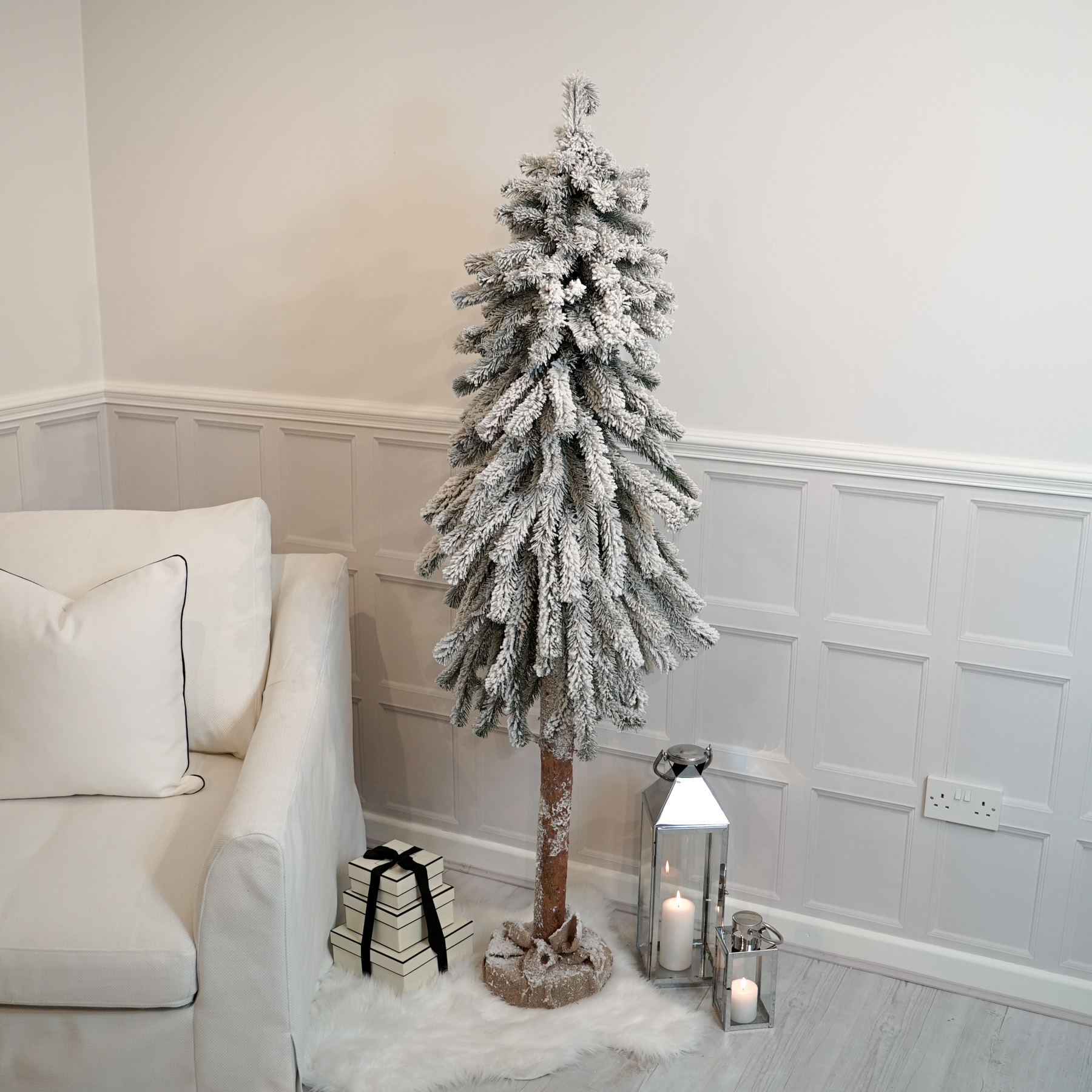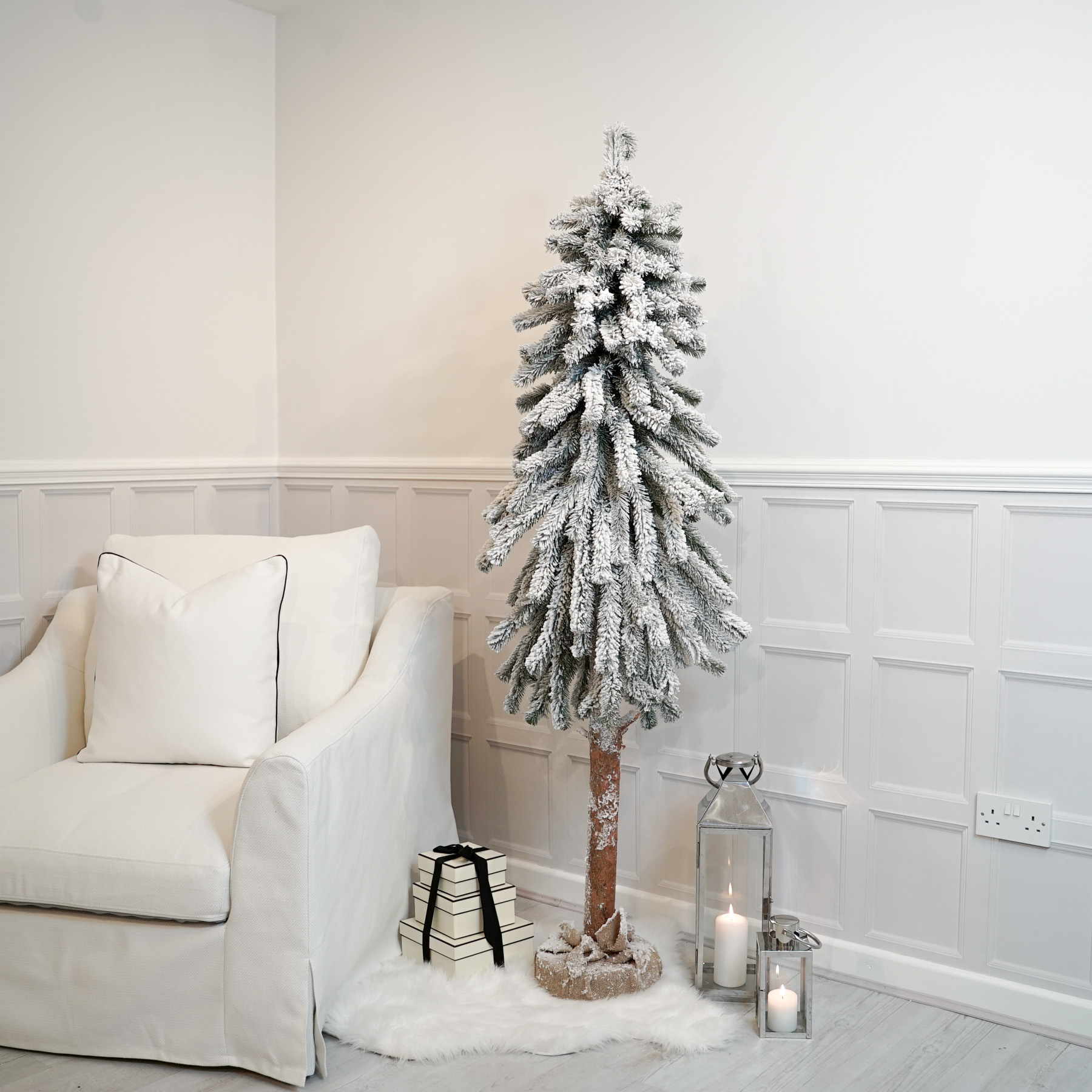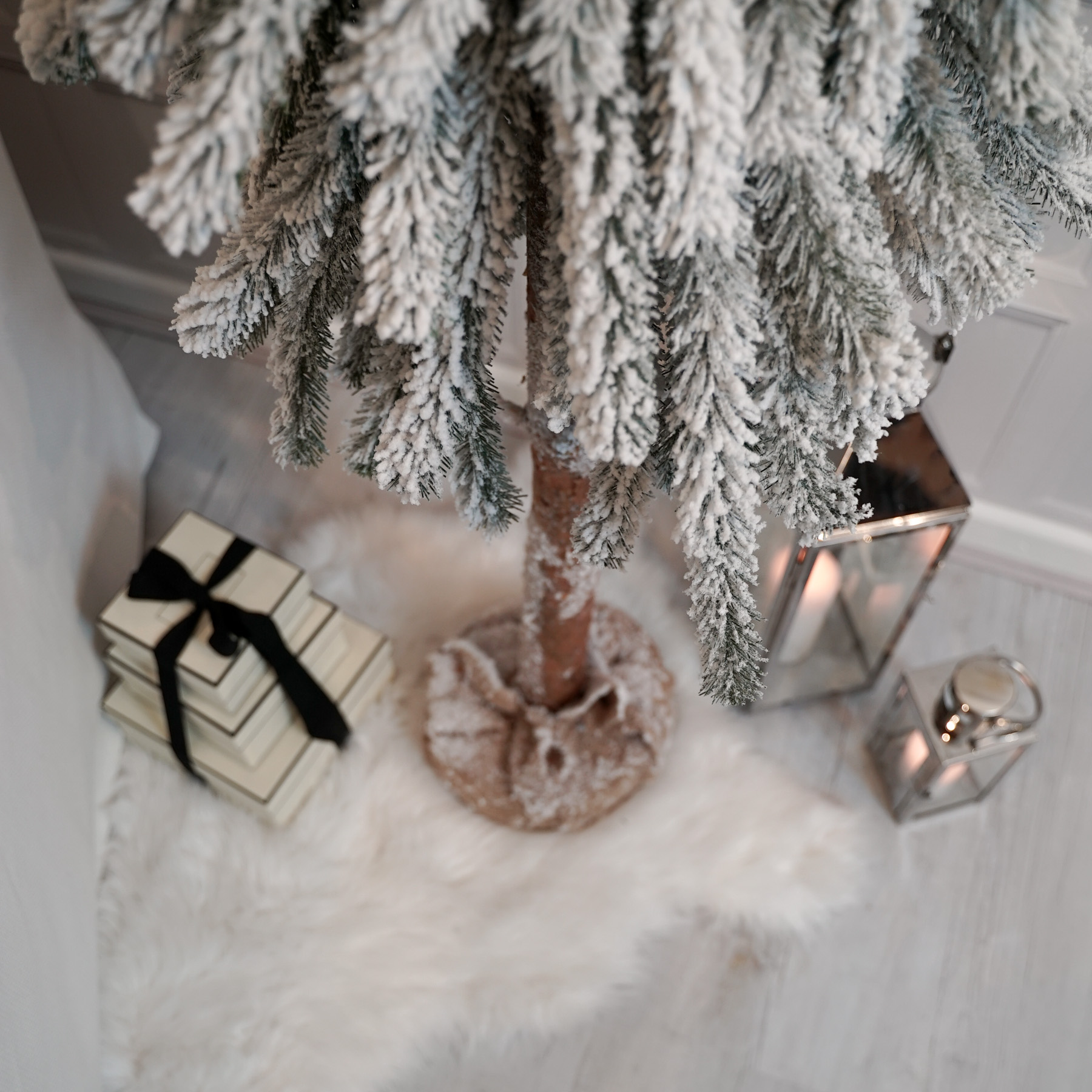 Luxurious, nordic style, handmade faux Christmas tree with natural trunk, finished with elegant frosting and natural linen cloth. This unique and incredibly realistic tree is easy to assemble and require no decoration. It is proportionally slim, making it perfect for even the smallest of spaces.