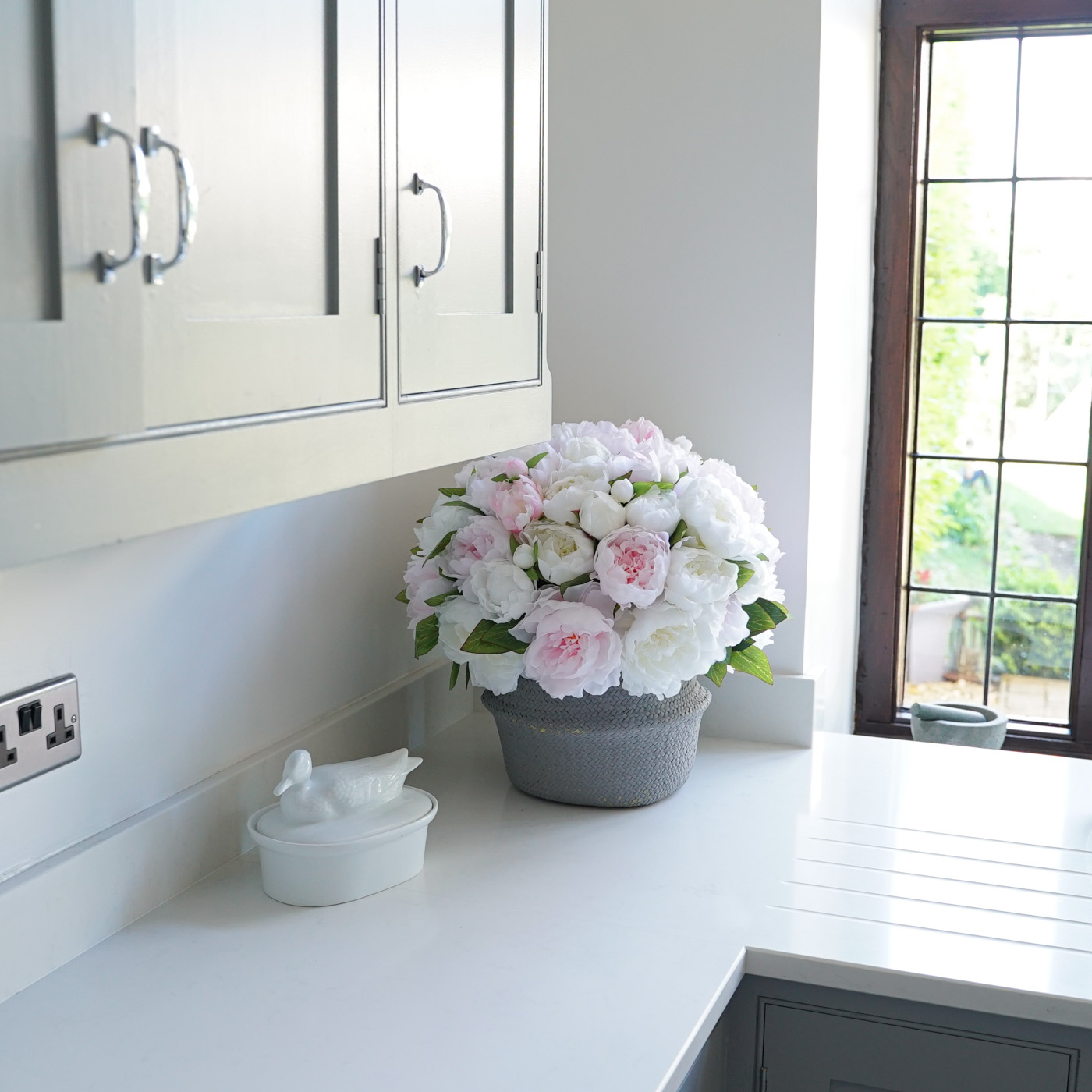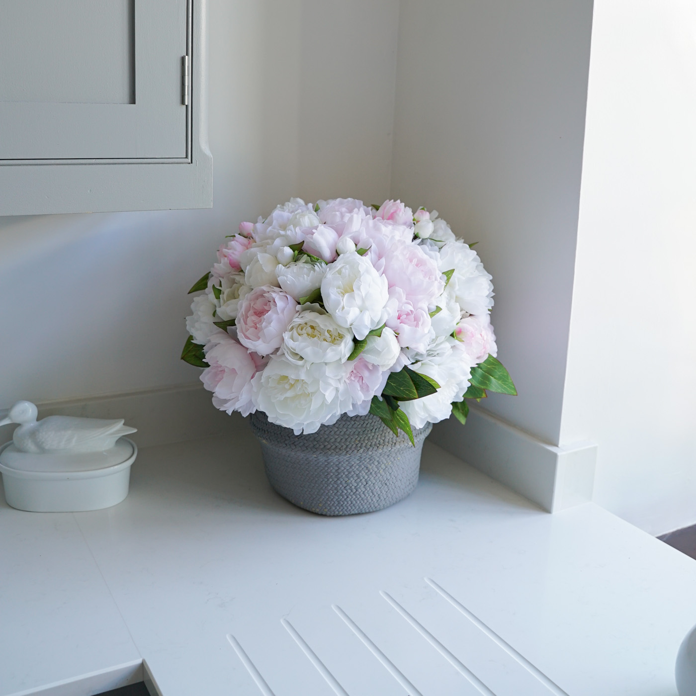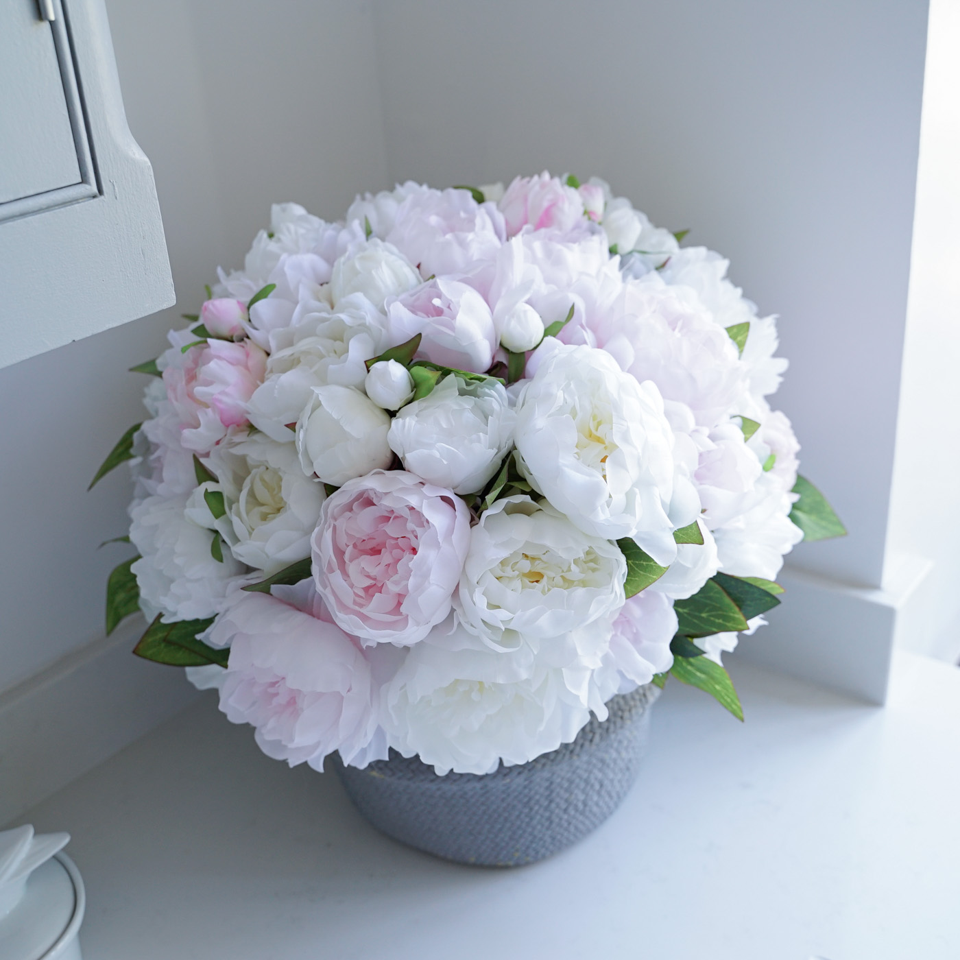 This beautiful basket full of silk peonies is an absolute showstopper! It was handmade by us using approximately 80 stems of silk blush pink and white peonies. It is like no other and to achieve the most realistic look, we used flowers in varied stage of blooming, from closed buds to a fully open heads as well as carefully balancing the proportion of colours. This gorgeous display is set in grey rattan, slightly distressed, basket – measuring approximately 45 cm in height and with flower crown of 40 cm in diameter.  It was designed to catch attention and fill your home with luxury and beauty. It is perfect for any space  – from salon, dinning room to entry hall and staircases. Truly breathtaking, it’s the perfect touch of splendour for your home!