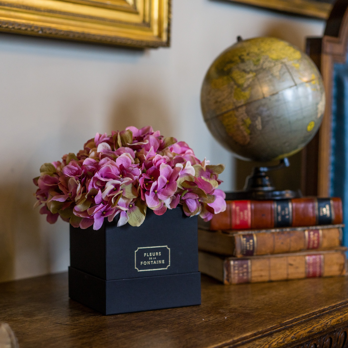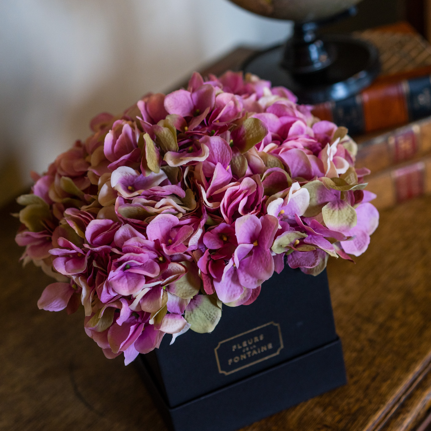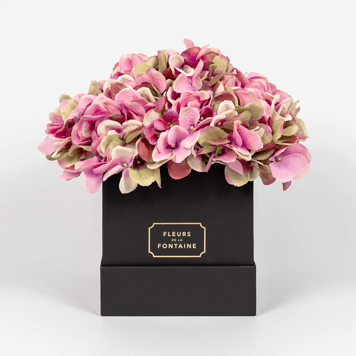 Be the first to review “Silk Pink Hydrangeas in Black Square Hat Box”