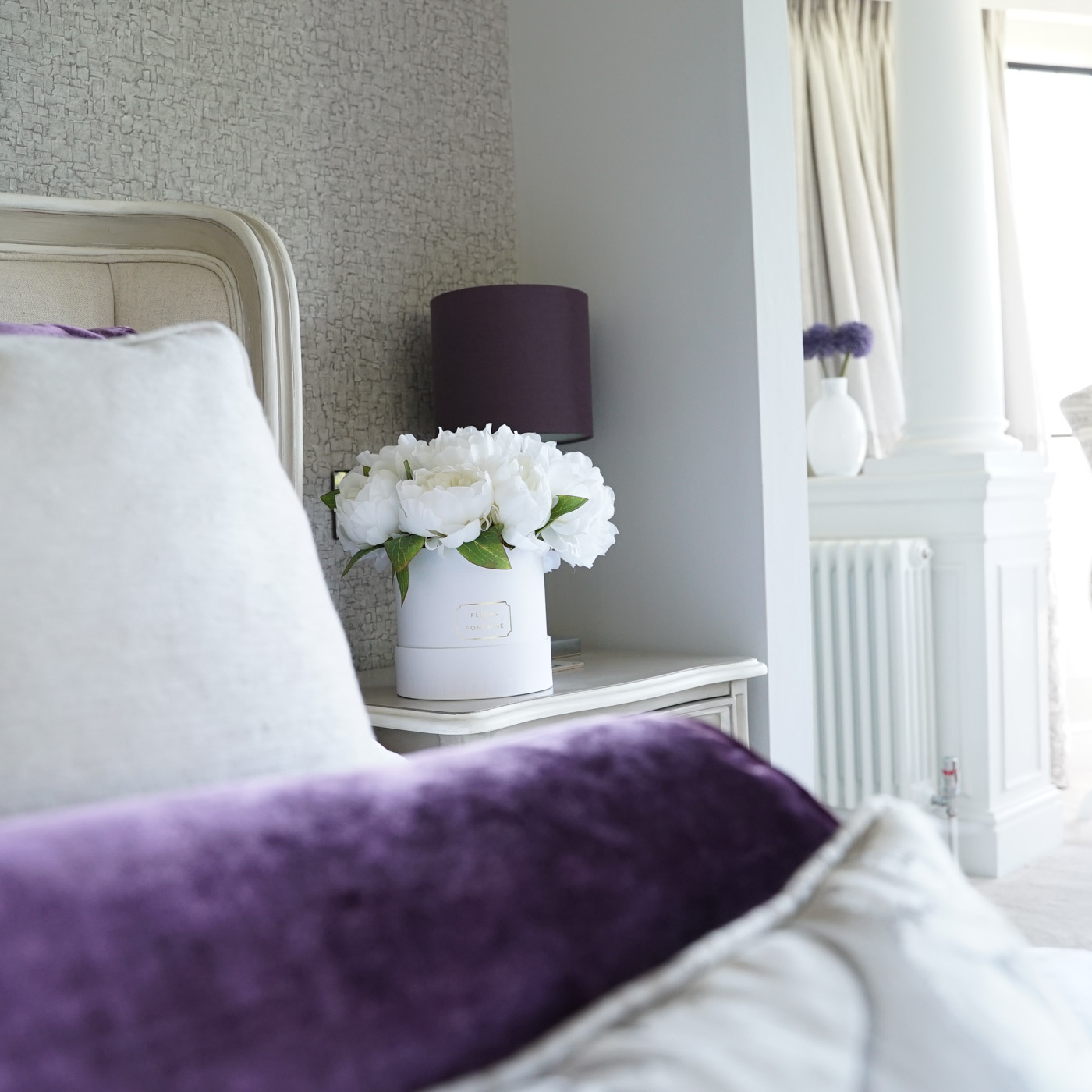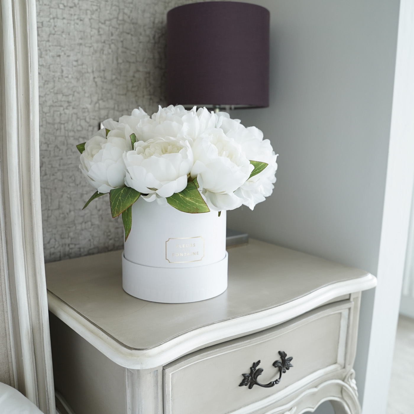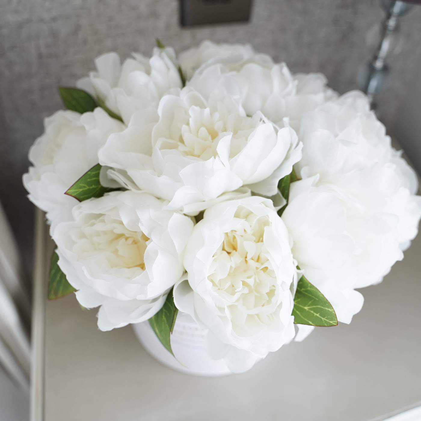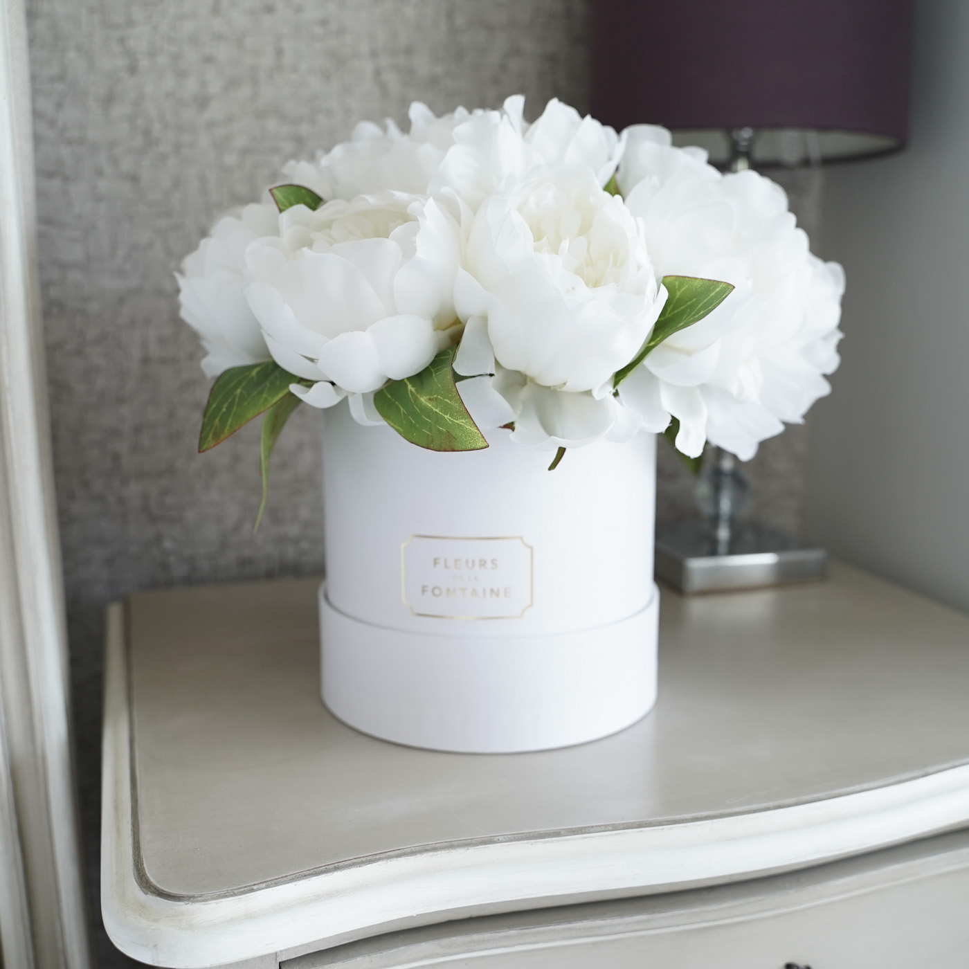 Beautiful and perfectly formed arrangement of silk white peonies in a stylish hat box. This simple, contemporary and sophisticated flower box was designed and handmade by us, Izabella and Charlotte, in the comfort of our homes in England. It was created with the purpose to subtly elevate the individual style of your home and it is ideal for sideboards, dressers and coffee tables. Modest yet exquisite, this piece is a real treat and an eye catching must have!