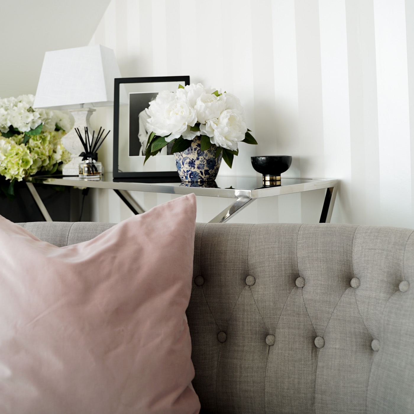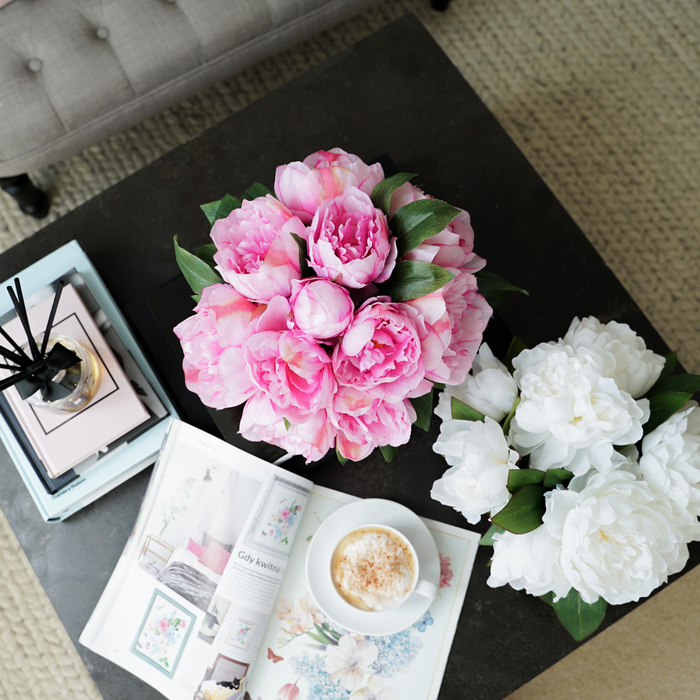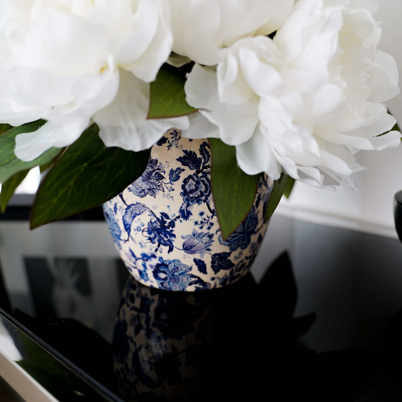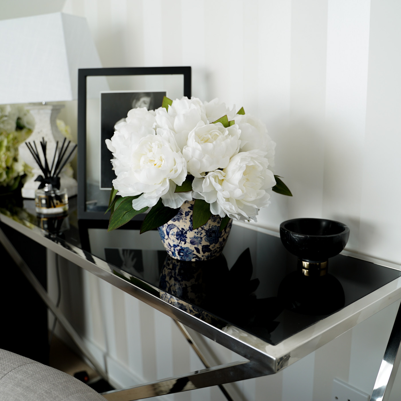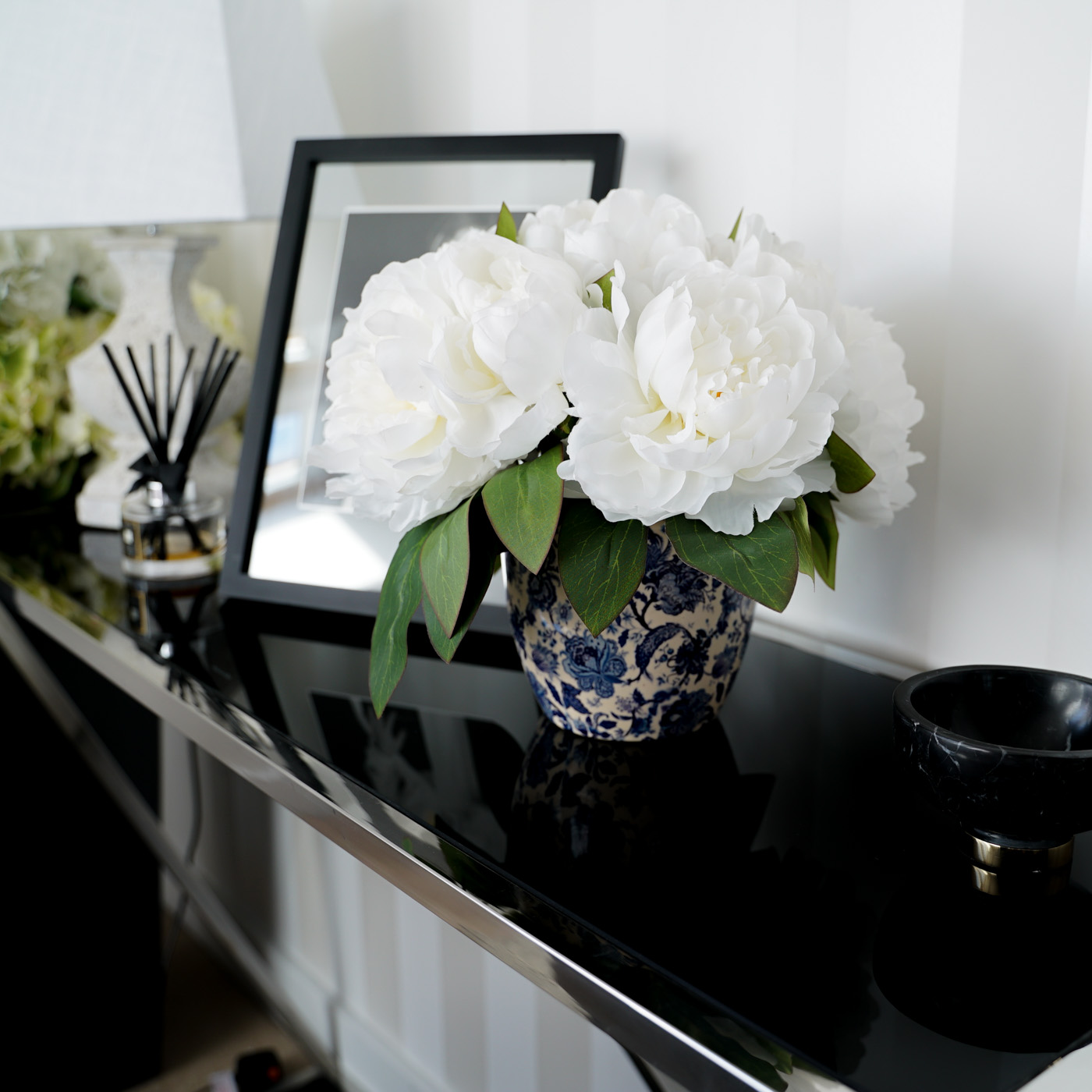A stunning and perfectly formed silk peony arrangement in an ivory and blue pattern ceramic vase. This classic and simple design that is perfect for any area of your home – a coffee table or side board decoration in your living room or bedroom as well as an entry hall or your kitchen. This design is slightly smaller of the two sizes, standing 25 cm tall with crown diameter 25 cm and including 12 stems of silk white peonies. The flowers are not permanently set in the vase allowing you to arrange the blooms to your taste.